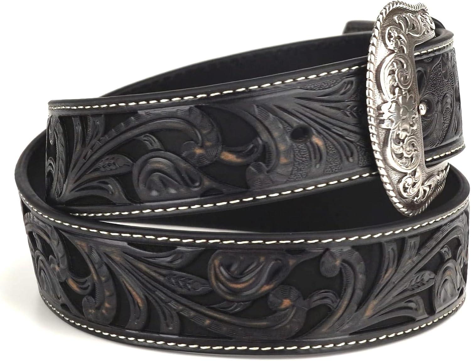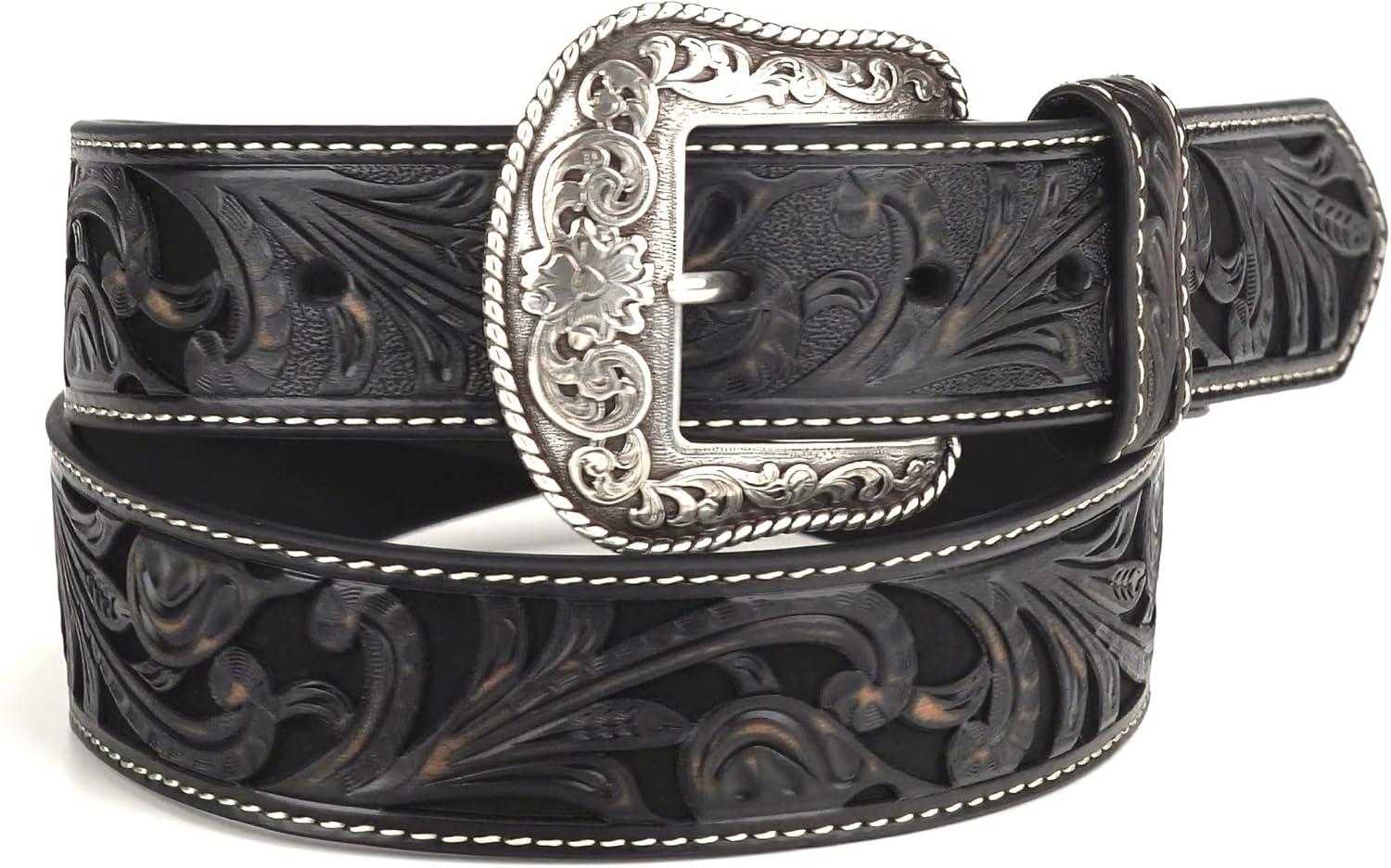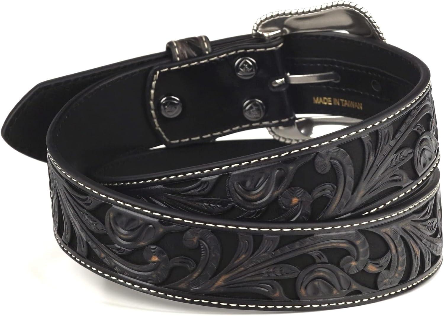 ARIAT Men’s Floral Embossed Leather Belt with Antiqued Silver Cowboy Buckle(Black/Tan)