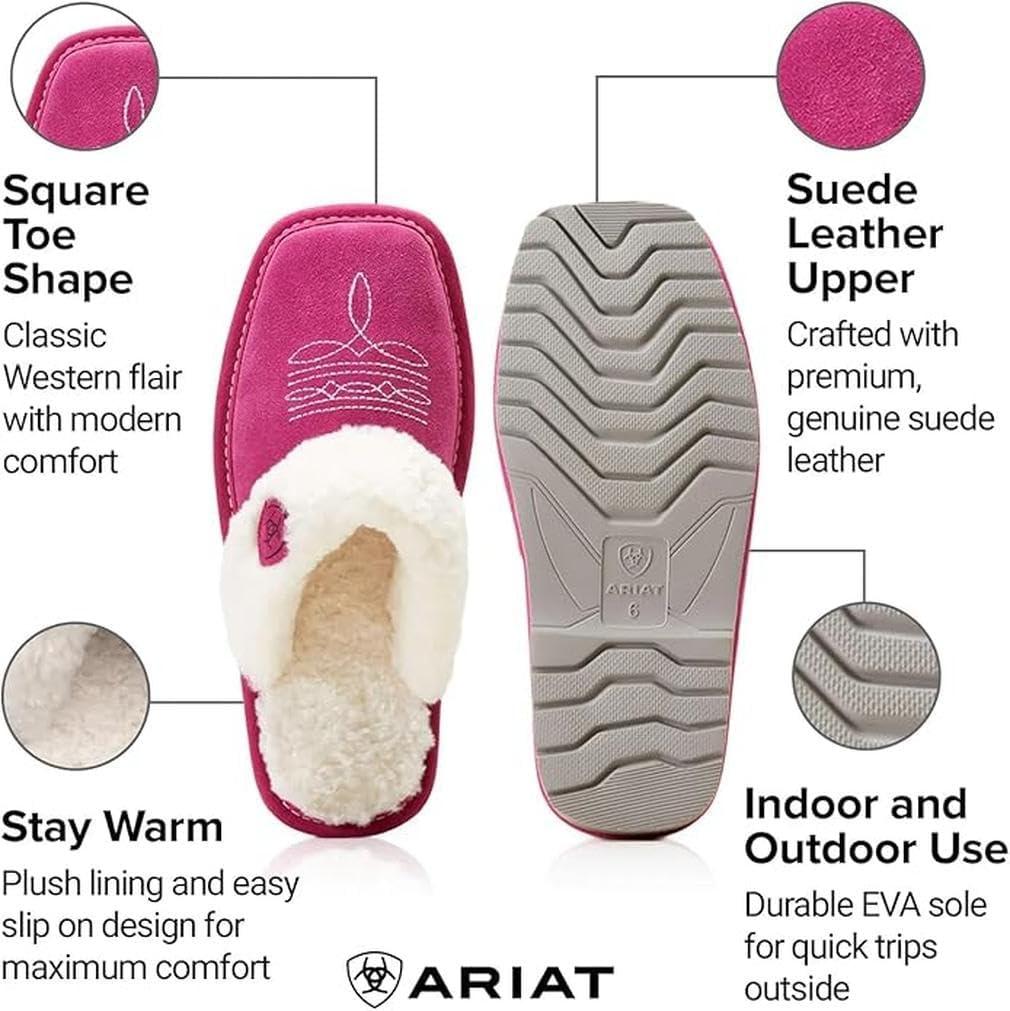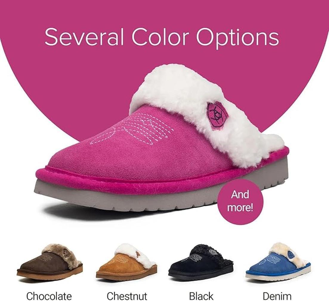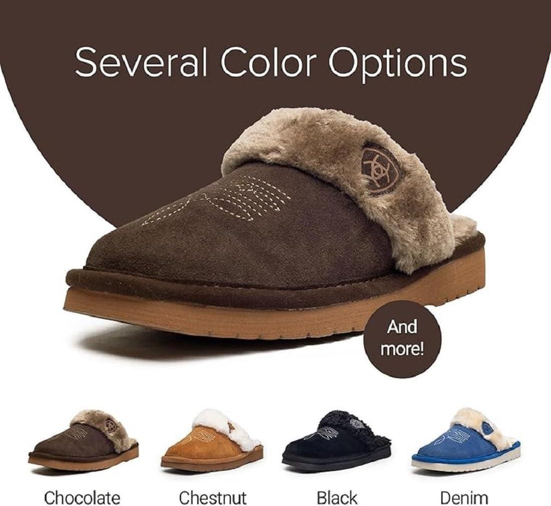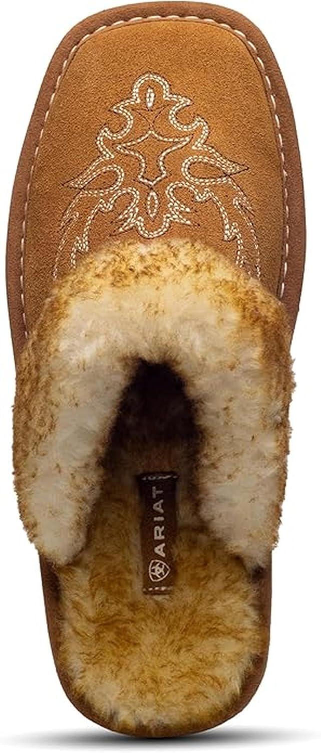 ARIAT Women’s Jackie Square Toe Warm Soft Genuine Suede Leather Indoor Outdoor Slippers with Plush Collar(Embroidery)