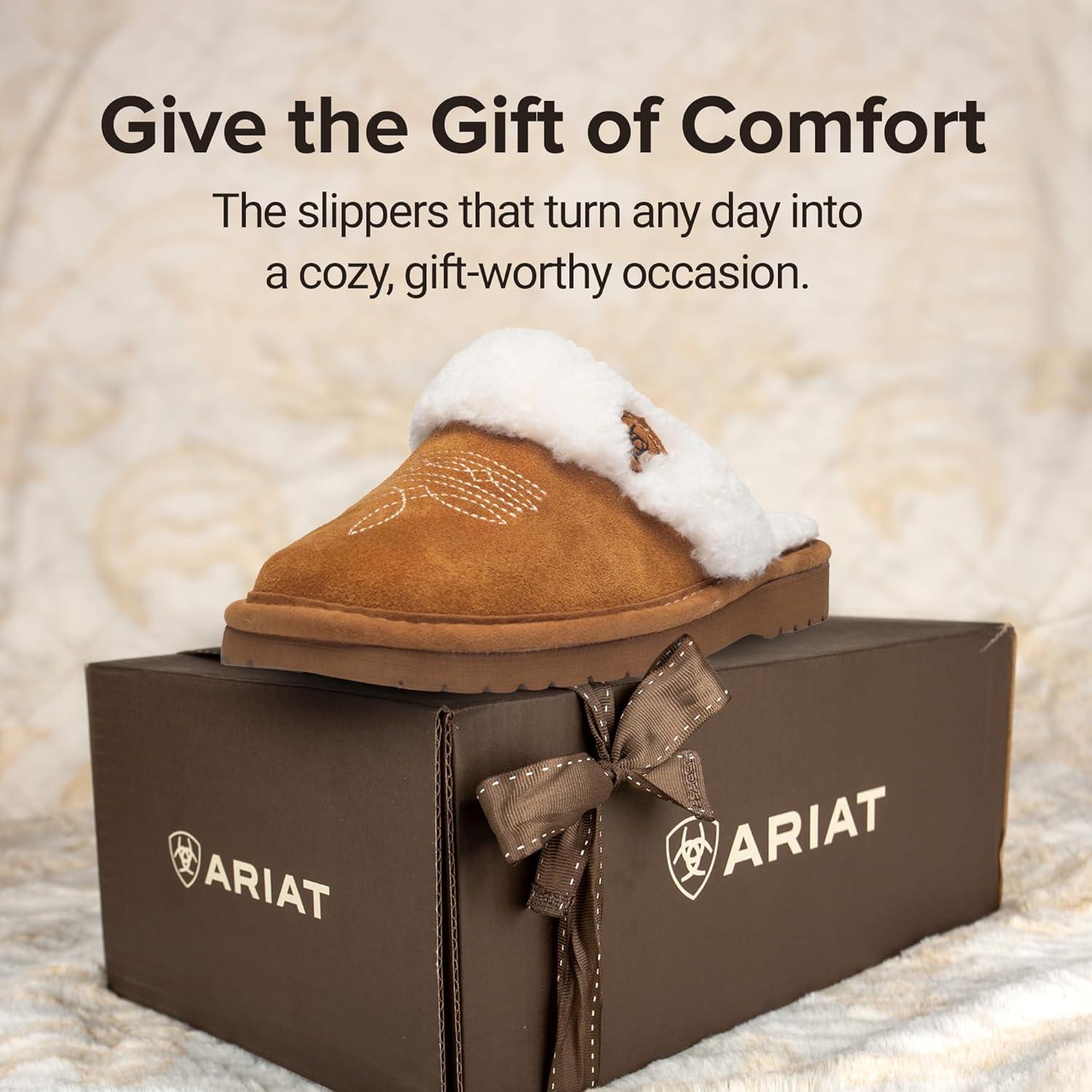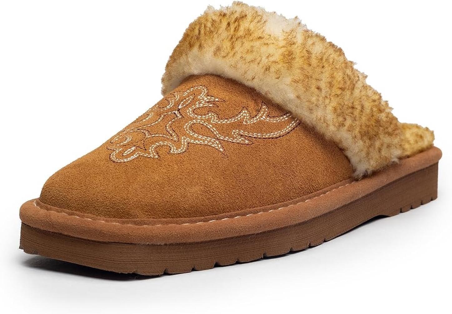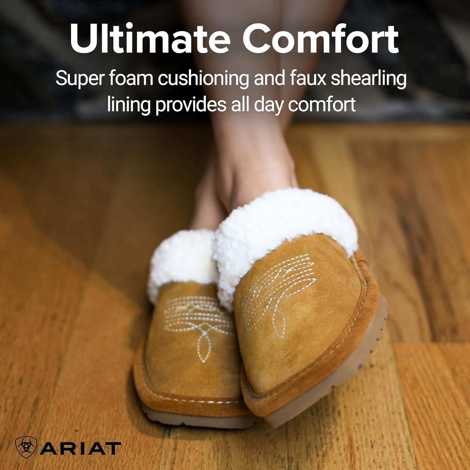 ARIAT Women’s Jackie Square Toe Warm Soft Genuine Suede Leather Indoor Outdoor Slippers with Plush Collar(Embroidery)