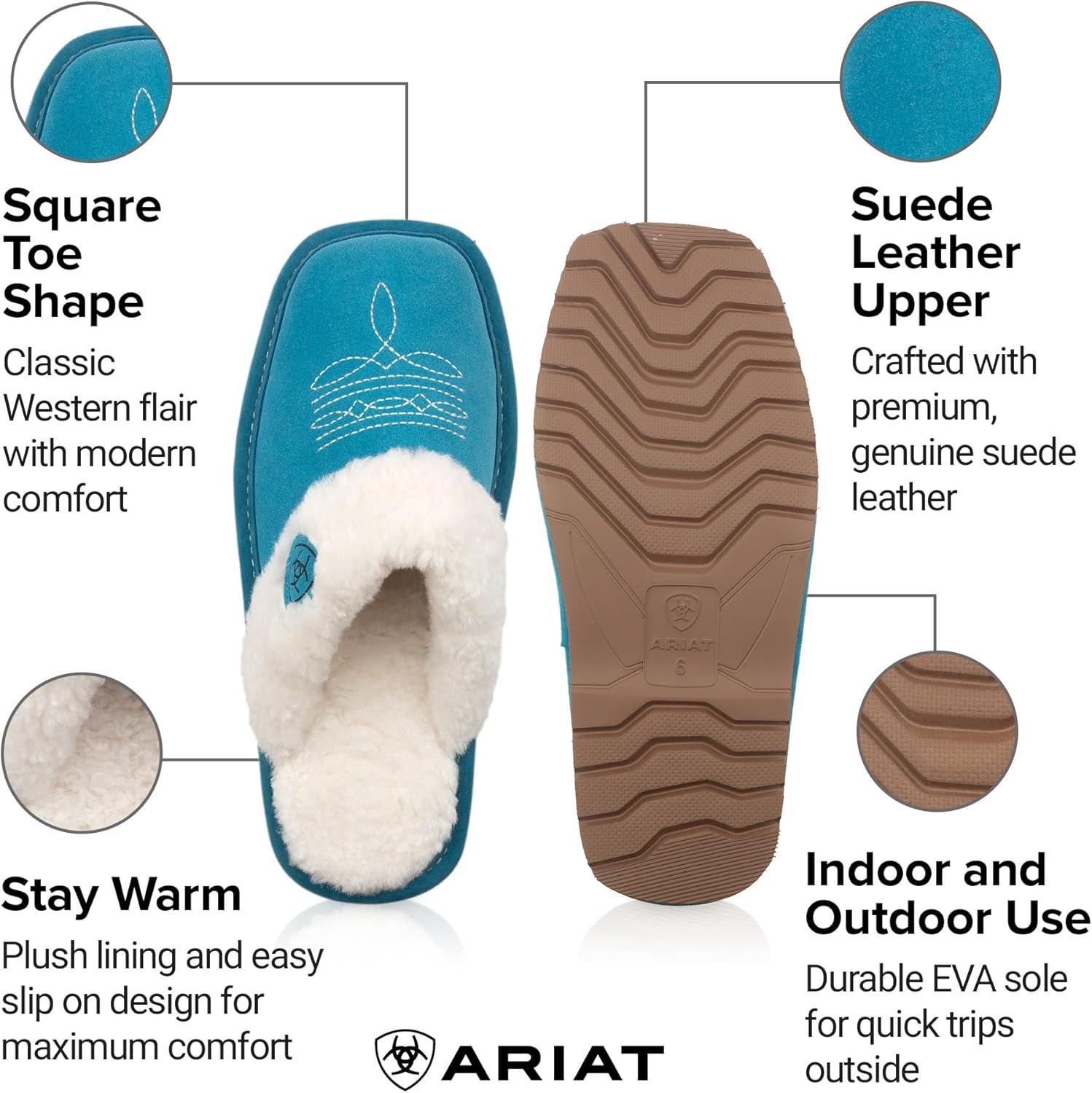 ARIAT Women’s Jackie Square Toe Warm Soft Genuine Suede Leather Indoor Outdoor Slippers with Plush Collar(Turquoise)