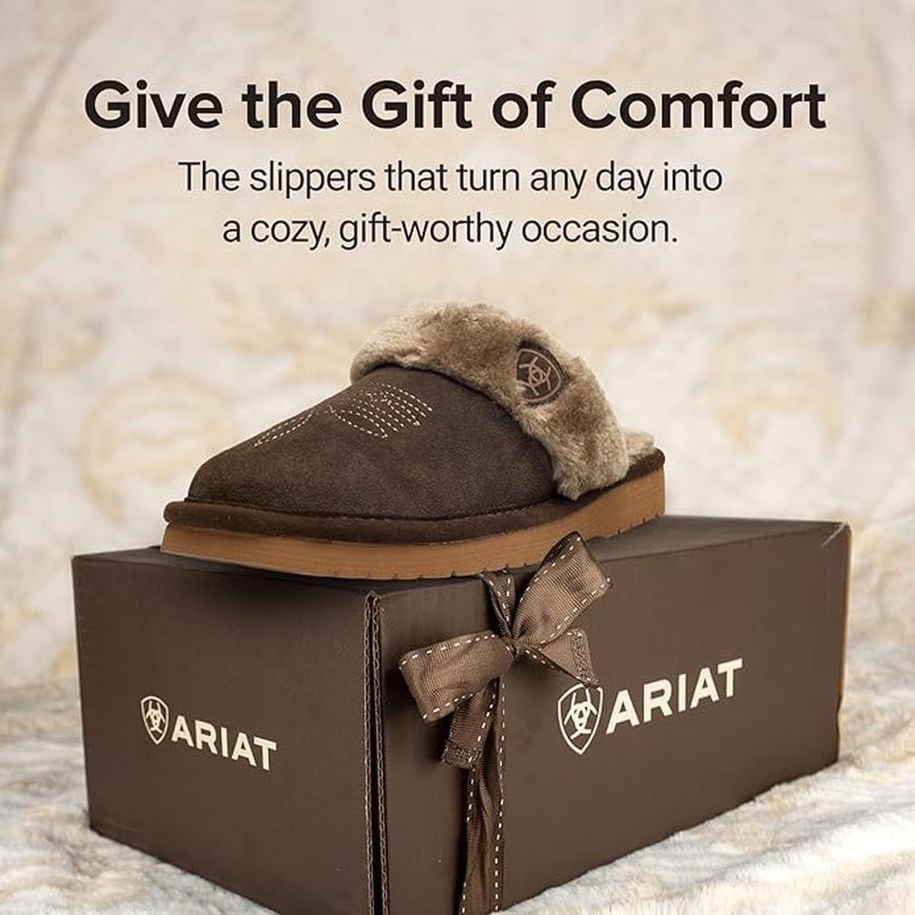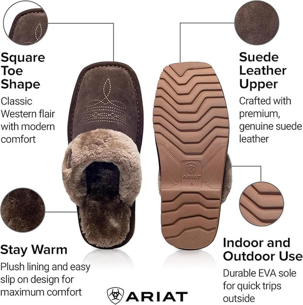 ARIAT Women’s Jackie Square Toe Warm Soft Genuine Suede Leather Indoor Outdoor Slippers with Plush Collar(Chocolate)