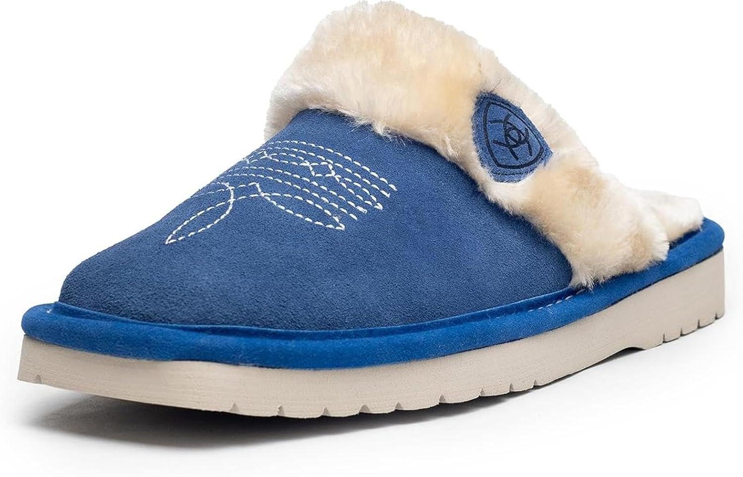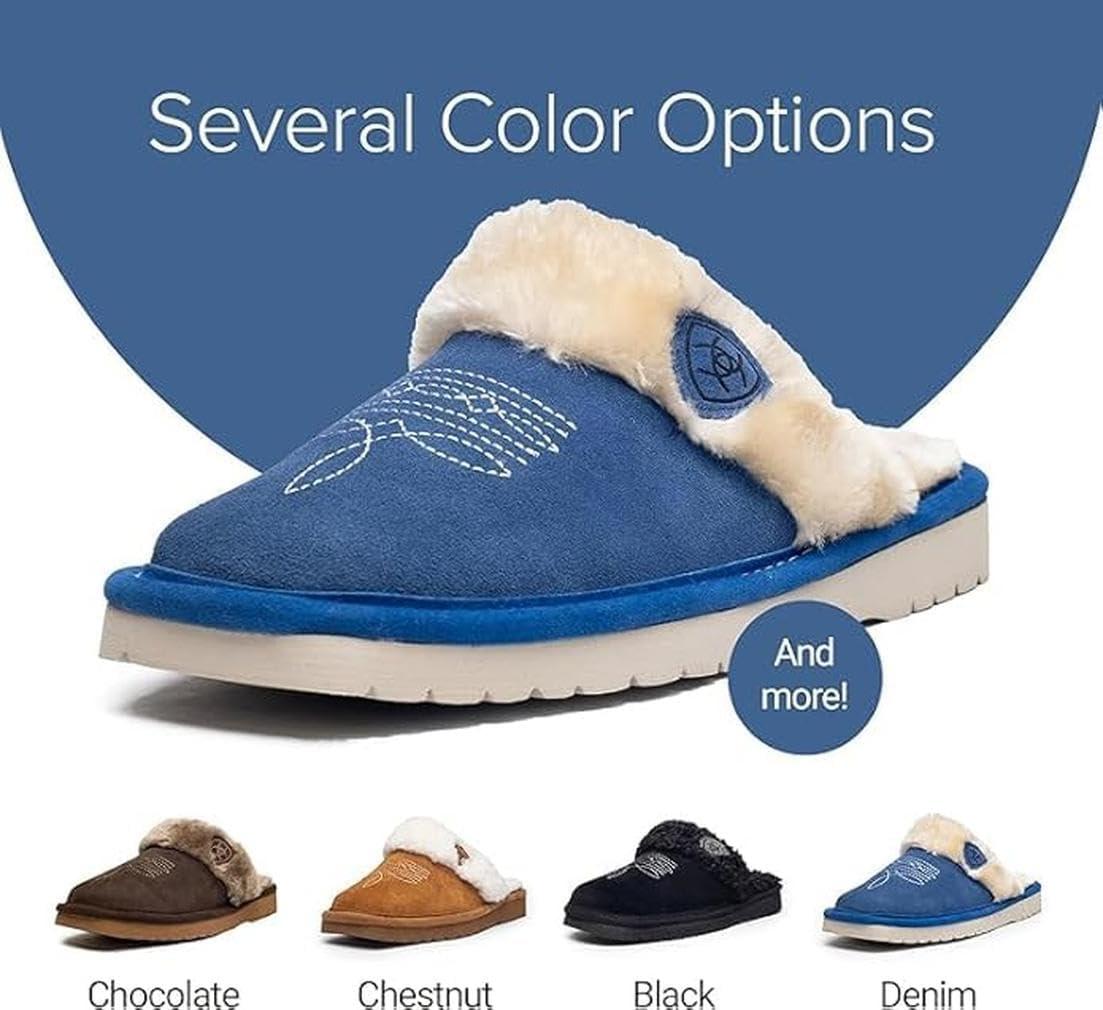 ARIAT Women’s Jackie Square Toe Warm Soft Genuine Suede Leather Indoor Outdoor Slippers with Plush Collar(Denim)
