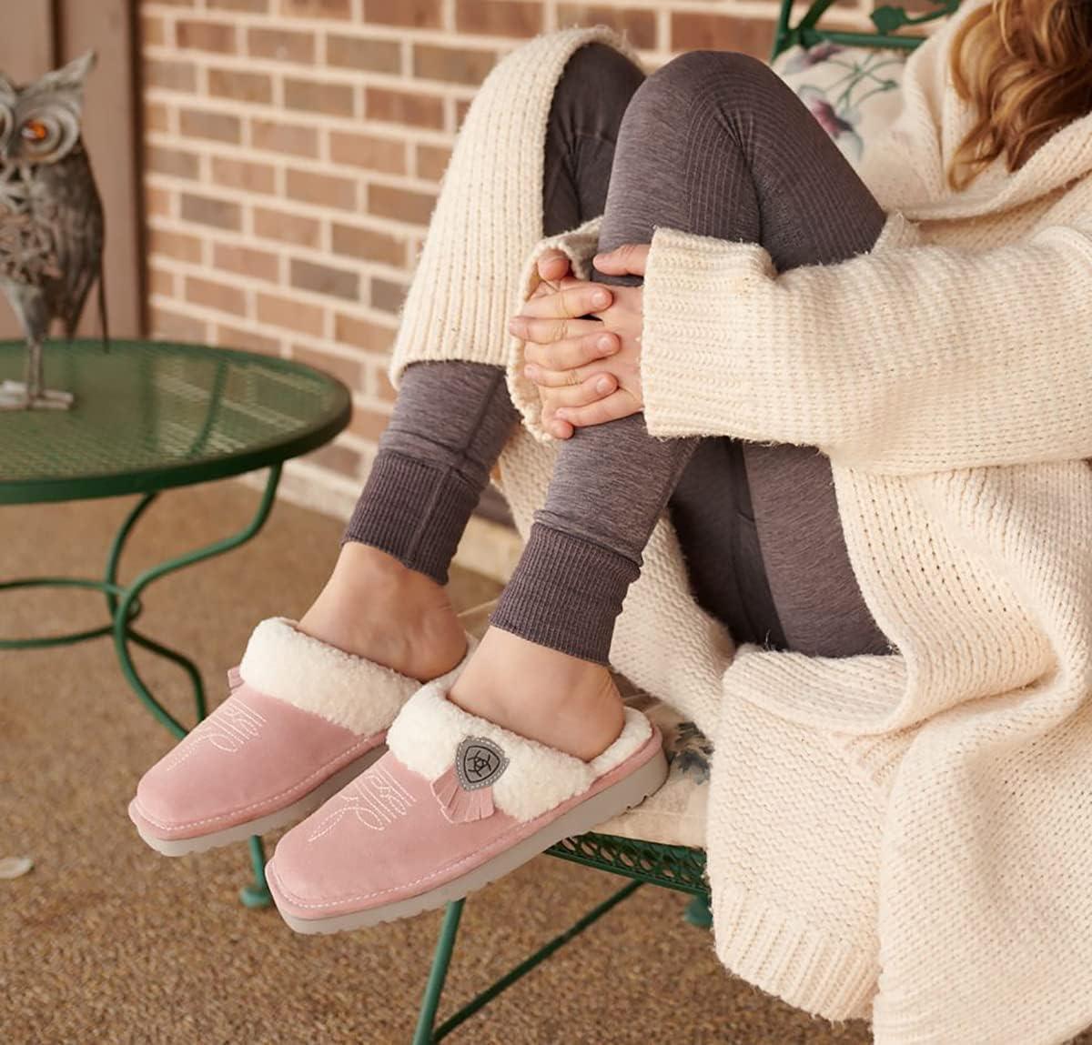 ARIAT Women’s Jackie Square Toe Warm Soft Genuine Suede Leather Indoor Outdoor Slippers with Plush Collar(Pink)