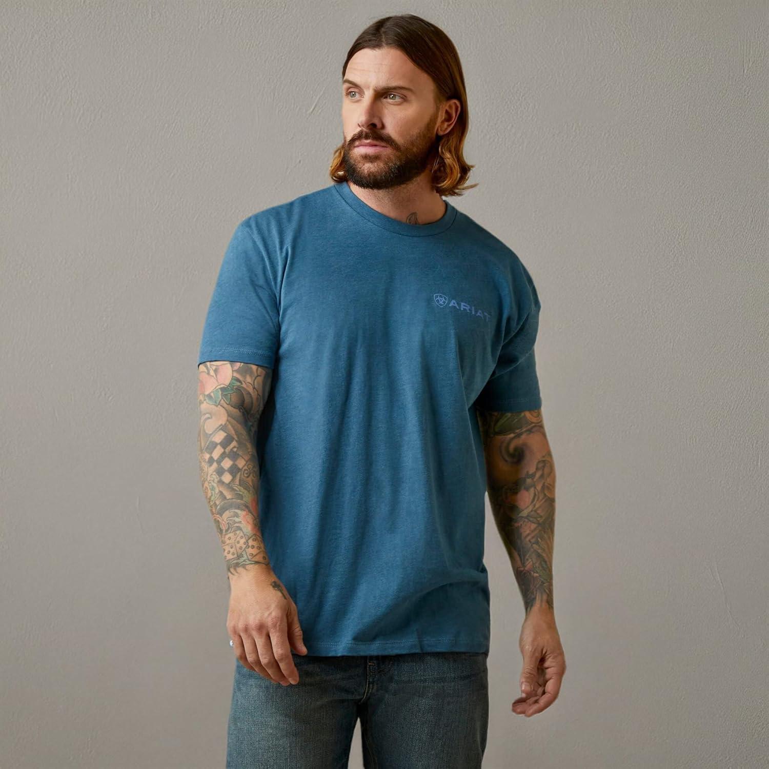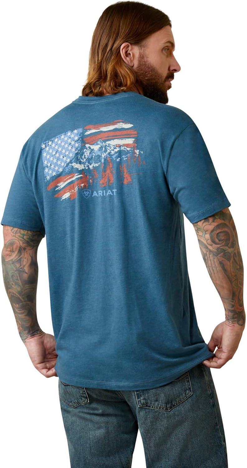 ARIAT Men’s Buckaroo T-Shirt, Buckhorn(Steel Blue Heather/Mountain Flag)