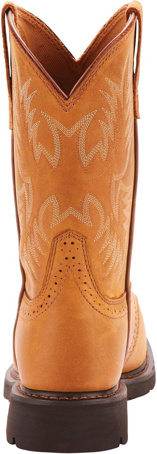 The Sierra Saddle Work Boot by Ariat is ready to join you in your next workplace endeavor. This classic western boot combines the durability of premium full-grain leather that keeps your foot protected with the lovely 6-row stitching detail for a timeless western style. It features a gel-cushioned insole with heel stabilizer and is designed with Ariat’s exclusive ATS technology for stability and all-day comfort. This advanced technology leads to lower fatigue and less strain on the joints of your feet. Designed with heavy-duty oil- and slip-resisting Duratread outsole, these pull-on work boots are complete with Goodyear welt construction for added durability. Its high heat-resistant outsole is suitable for the most demanding workplaces, complete a with ASTM F2413-18 M I/C EH rated safety toe and ASTM F2892-11 EH rated soft toe, making it perfect for railroad welding work and other high heat environments (tested to 750-degree Farenheit/400-degree Celsius).