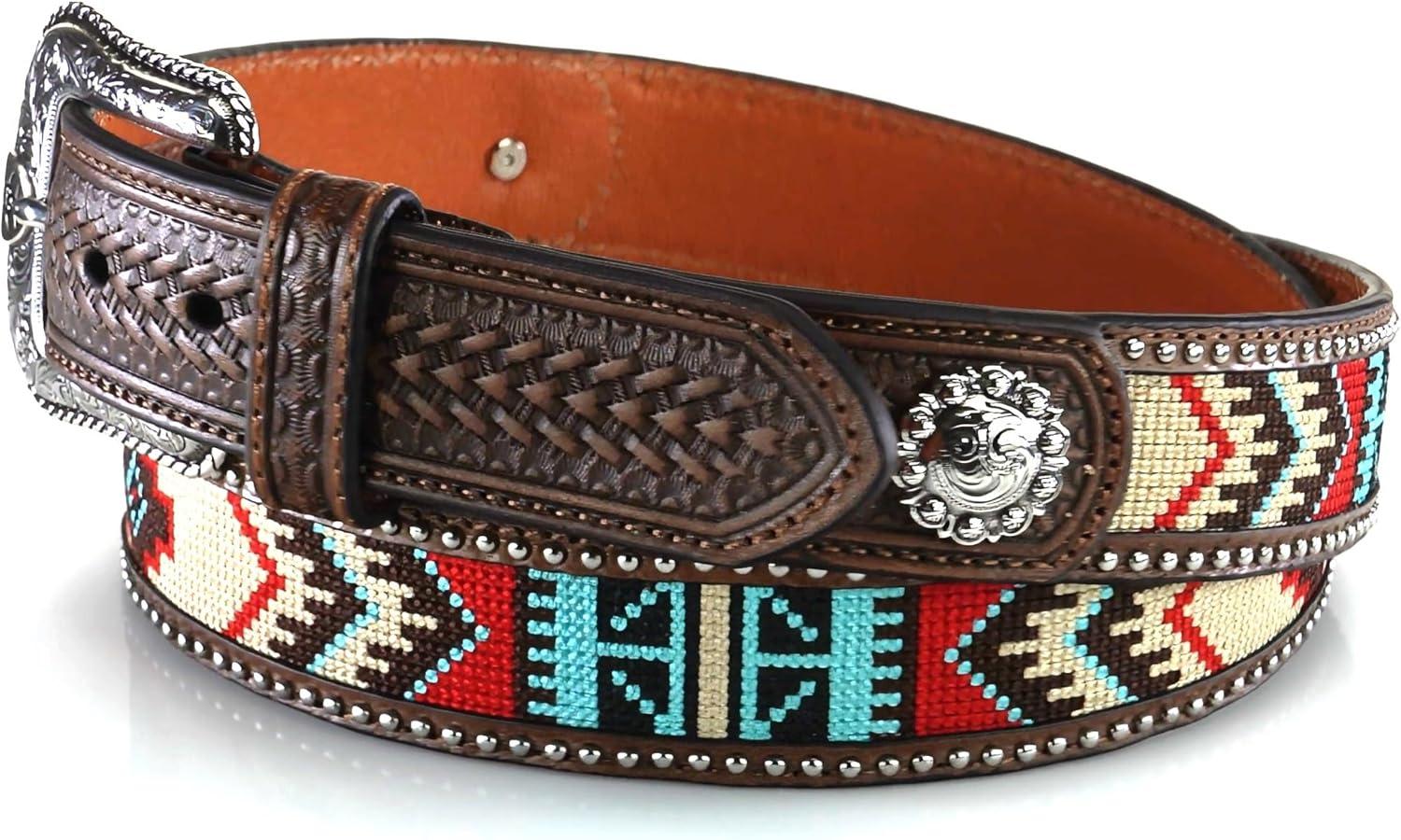 Mens Ariat Belt: Mens Ariat Western Accessory. This Ariat men’s belt by M&F Western Products is genuine leather and has a stunning blue and turquoise southwestern pattern embroidered on the 1 1/2″ strap. Removable buckle. A1038702