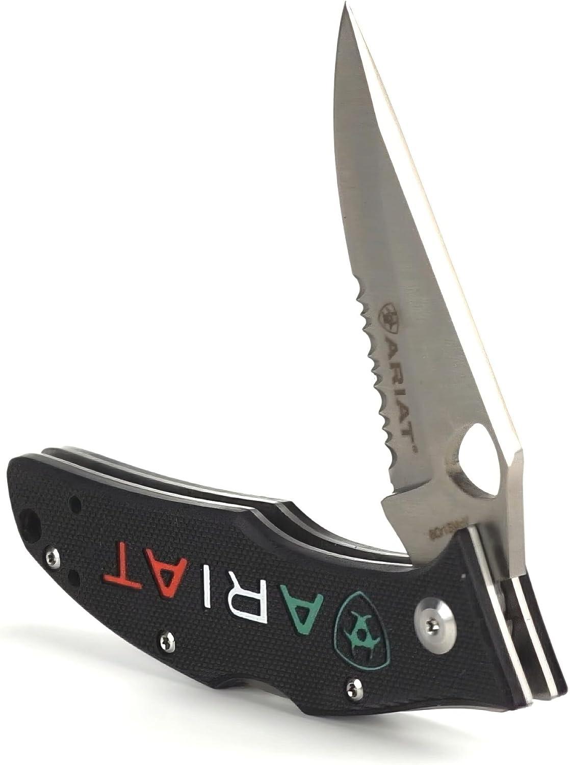 G10 Black Handle: Lightweight, rugged composite with textured grip and Mexico-inspired Ariat logo detail in red, white, and green.