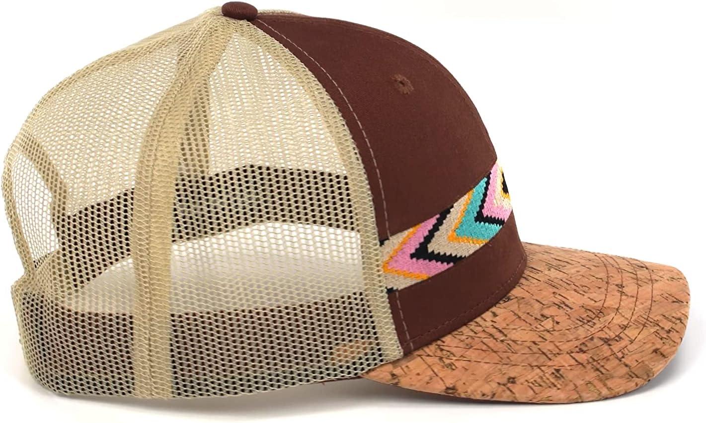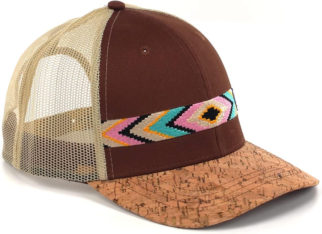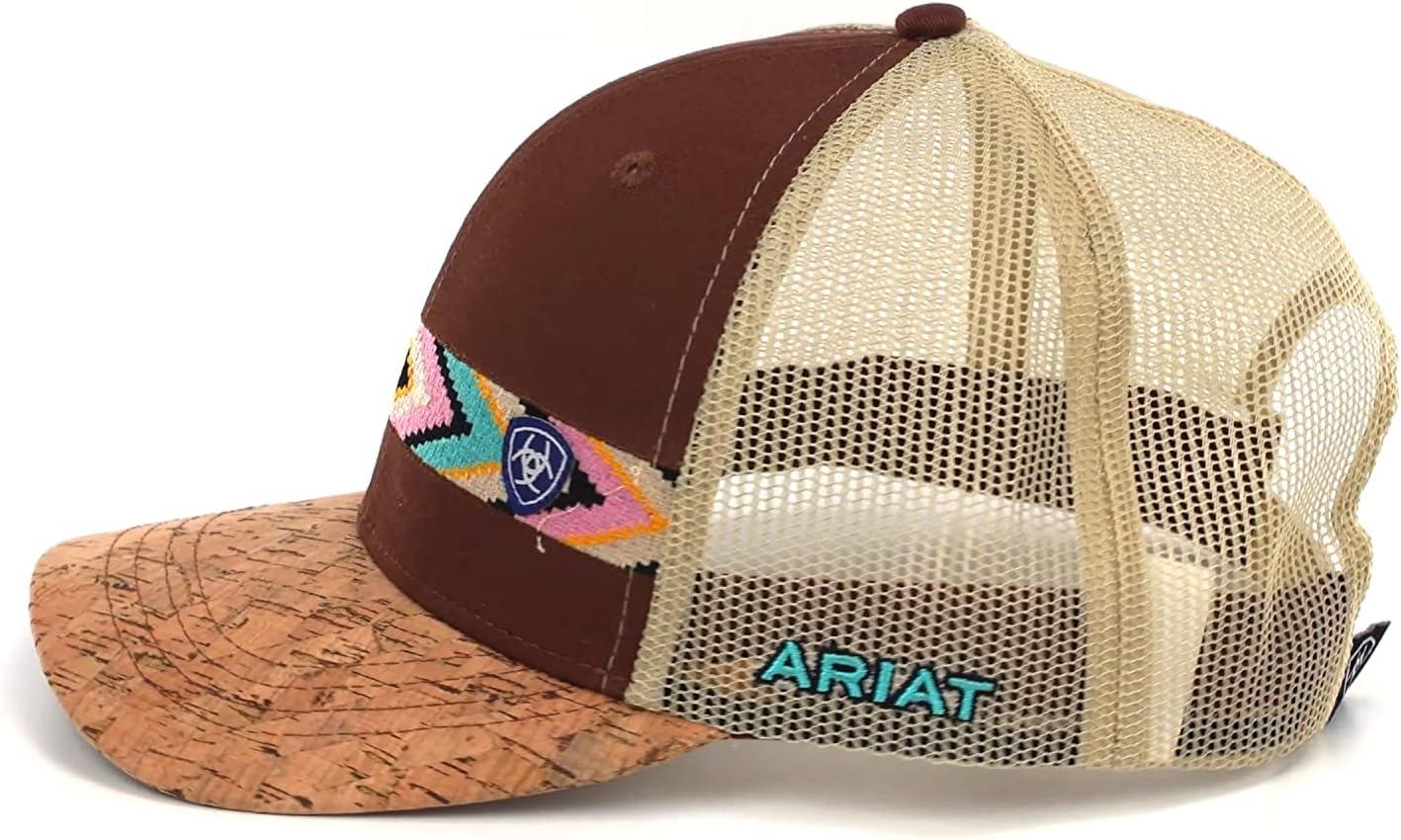 Nice Ariat ladies cap . Brown front panels with embroidered Aztec design with Ariat shield and cork bill. Tan mesh back panels with Ariat embroidered in turquoise on right side. Snapback closure for a perfect fit.